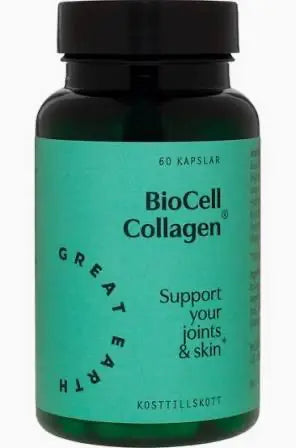 Great Earth Biocell Collagen 500mg 60 kapslar produceras genom en patenterad process som avsevärt minskar molekylstorleken av kollagen, hyaluronsyra & kondroitinsulfat för ett snabbt upptag. BioCell Collagen produceras genom en patenterad process som avsevärt minskar molekylstorleken av kollagen, hyaluronsyra, och kondroitinsulfat för ett snabbt upptag. Andra kollagentillskott hydrolyseras inte, vilket resulterar i en molekylstorlek som är för stor för kroppen att ta upp. Den unika sammansättningen har beviljats patentskydd och har genomgått kliniska prövningarMängd per dagsdos Rekommenderad daglig dos: 2 kapslar